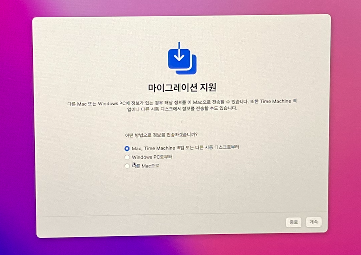- 왼쪽이 아이맥(이전맥에서는 '다른 맥으로' 를 클릭 한다.
