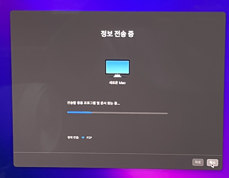 - 다른 맥에서 마이그레이션 지원을 열어서 대화상자가 나타나면 다른 Mac에서 정보 전송을 선택하십시오..라는 메세지가 나온다.. (이미 맥미니에서 마이크레이션 앱을 실행해서 우측 사진 처럼 이 Mac으로 정보 전송 화면이 나온다.)