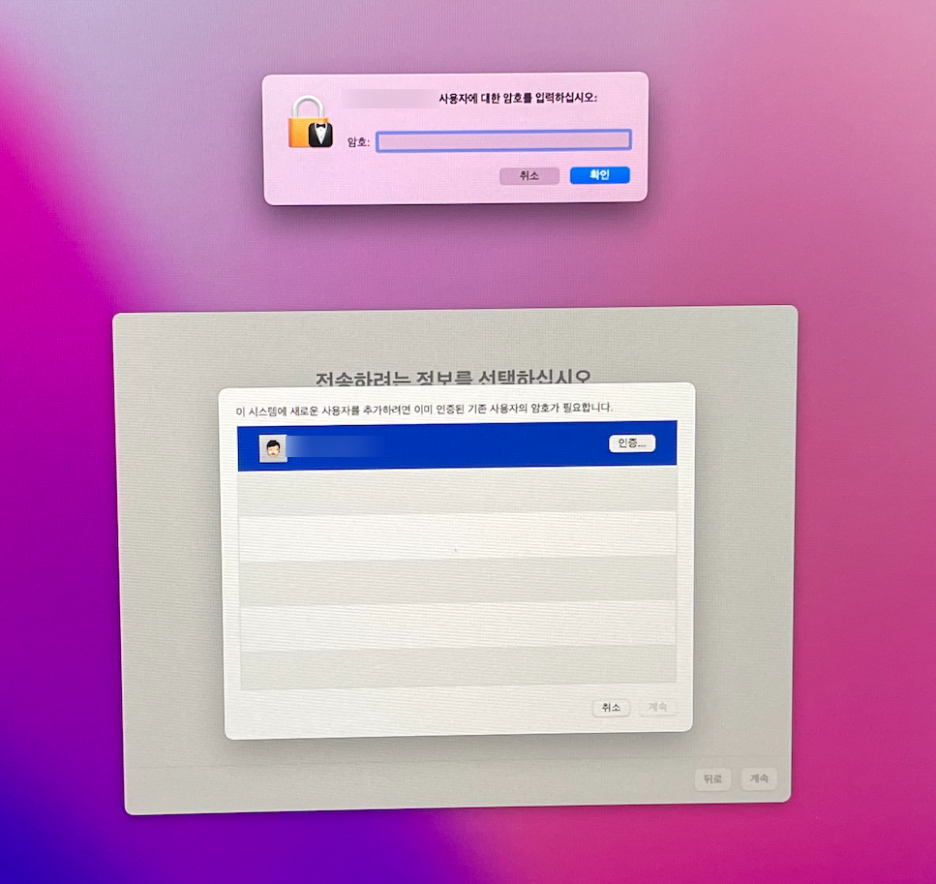 - 신규 M1 맥미니에 사용자 암호 입력 팝업창이 떠요..그럼 가볍게 비번 넣어주시고요...